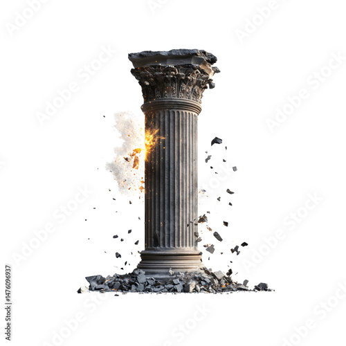 destruction, ruin, demolition, crumbled, breaking, fracture, impact, explosion, debris, fragment, dust, spark, fire, light, energy, power, force, dramatic, intense, texture, grey, stone, marble, architecture, history, heritage, bequest, authority, civilisation, fall, decayed, end, crisis, catastrophy, chaos, instability, abstract, conceptual