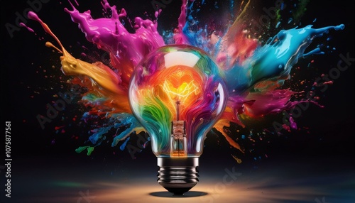 Exploding light bulb with colorful paint splashes on black background, symbolizing creative ideas.