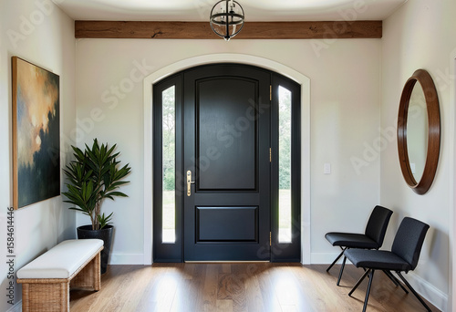 Explore a sophisticated home entry featuring striking arched doorways, captivating landscape paintings, and plush seating options that create a warm, inviting atmosphere for family gatherings or quiet