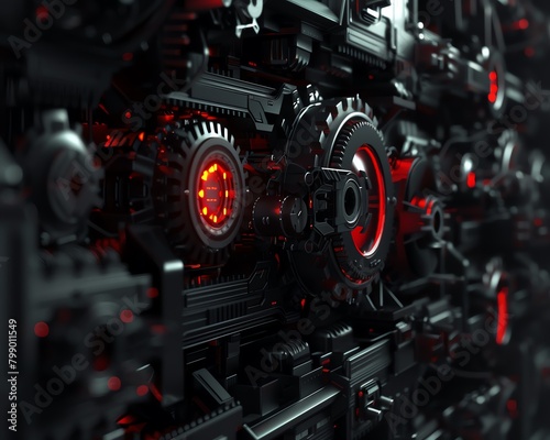 Explore the fusion of innovation and fear in a close-up view of Futuristic Technologies with a horror-themed twist Render the intricate mechanisms in CG 3D rendering, emphasizing shadow and ominous li