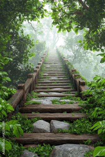 Exploring a fairy tale wooden bridge leading into a hidden forest village shrouded in mist