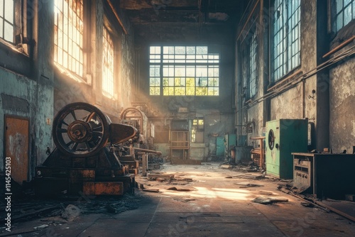 Exploring abandoned factory ruins with rusty machines industrial landscape interior photography urban decay dramatic lighting nostalgic conceptual art