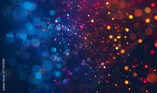 Exploring Cloud & Edge Data Transfer. Abstract Code, Interconnected Polygons, Multicolored Dots on Dark Blue Background