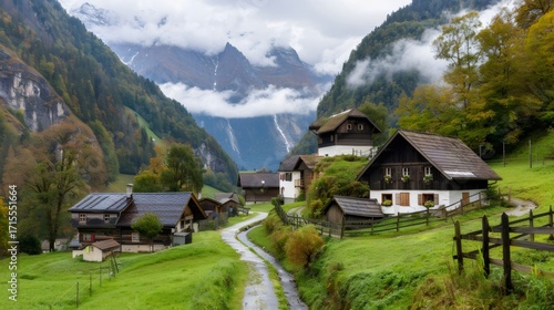 switzerland, vale, landscape, nature, mountain, house, house, waterfall, waterfall, water, cloud, green, grass, tree, wood, traditional, scenic, travel, tour tourism, destination, europa, swiss, alps, village, rural, countryside, outdoors, beauty, picturesque, autumn, fall