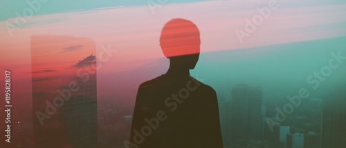 Exploring solitude in a vast urban landscape through double exposure of a human silhouette