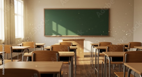 Exploring the Architectural Design and Composition of a Classroom Interior Revealing Row upon Row of Desks and the Dominating Presence of a Large Blackboard