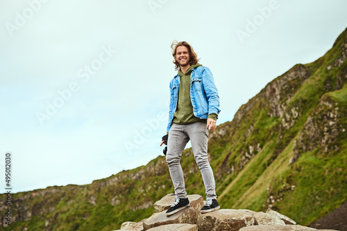 people, outside, person, outdoors, adventure, leisure, exploring, explore, explorer, exploration, adventurous, holiday maker, casual attire, caucasian, informal, natural, adult, looking, real, lifestyle, authentic, candid, content, destination, nature, young, carefree, man, male, smiling, standing, man, 20s, holding, view, travel, landscape, healthy, day, camera, hiking, copy space, holiday, vacation, rock, relaxed, active, mountain