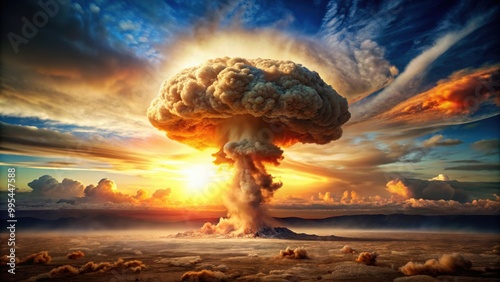 Explosion of a hydrogen bomb creating a massive mushroom cloud in the sky, nuclear bomb, catastrophe, destruction
