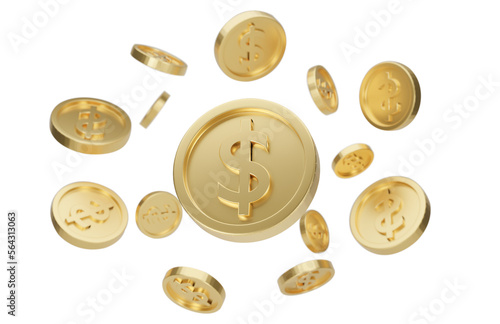 Explosion of gold coins with dollar sign isolated on transparent background PNG file. 3d rendering.