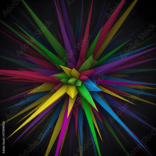 abstract, burst, explosion, starburst, pattern, vibrant, colours, spectrum, radiant, dynamic, energetic, geometric, pointed, sharp, spiky, radial, symmetry, modern, digital artwork, graphic design, background, wallpaper, illustration, creative, artistic, design, visual, bright, many-coloured, hallucinogen, kaleidoscope, splatter