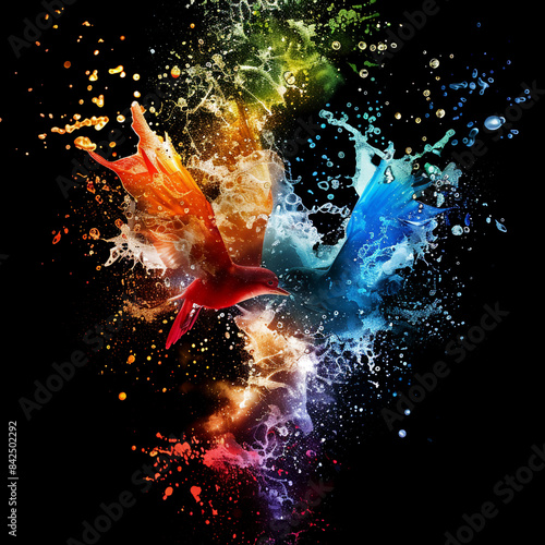Explosion splatter of colorful water birds eye view backlighting