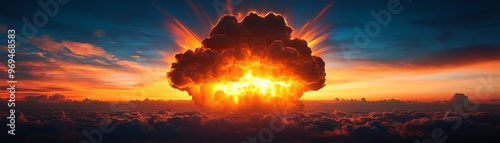 Explosive mushroom cloud at sunset, symbolizing power and destruction with a dramatic sky backdrop. Ideal for themes of energy and danger.