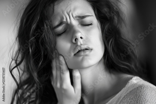 discomfort, woman, curly hair, indoor, expression, pain, jaw, emotion, lighting, portrait, beauty, health, tenderness, grieved, worry, touching, facial, feeling, mood, body language, closeup, soft light, concern, natural, candid, pained, serene, thoughtful, intimacy, skin, dark, light, greyscale, calm, stress, anguish, quiet, contemplation, expressionism, dramatic
