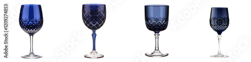crystal, glassware, goblet, wine, stemware, glasses, tableware, dining, drinking, beverage, decor, elegant, luxury, bar, eatery, party, table, setting, lifestyle, interior, blue, pattern, design, transparent, object, still life, collection