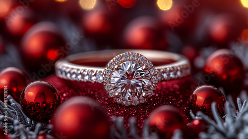 Exquisite engagement ring and Christmas decor. Minimalism. High quality photos. Stock photo.