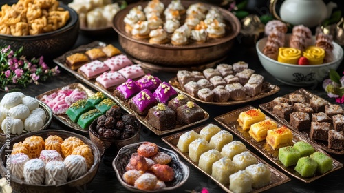 Exquisite festival sweets from different parts of the world, presented in elegant and luxurious serving dishes.