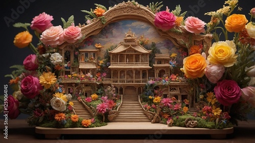 Exquisite floral art displaying a detailed carved wooden mansion surrounded by vibrant flowers in a creative arrangement on a rustic table setting