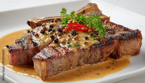 Exquisite gourmet t-bone steak with pepper sauce on a white plate, culinary presentation