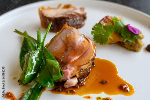 Exquisite suckling pig dish of modern French haute cuisine prepared with fresh organic ingredients from restaurant own garden and farm and beautifully served