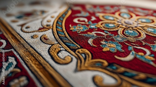 tapestry, design, pattern, textile, art, craftsmanship, embroidery, detailed, decorative, artistic, texture, elegant, floral, ornate, closeup, fabric, red, gold, weaving, timeless, luxury, beauty, intricate, motif, traditional, antique, vintage, closeup, detail, style, aesthetic, surface, composition, arrangement, refined, delicate, classic, element, shape, form, object, historical, cultural, heritage