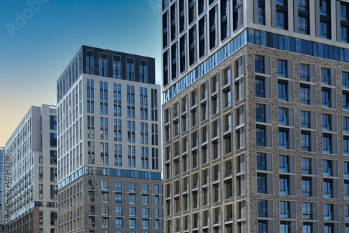 Exterior of a modern building house object with texture walls and windows. Luxury modern tall block of flats without balconies. Living apartments or office building. Real estate concept.