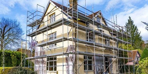 exterior, shot, house, scaffolding, during, construction, building, architecture, steel, scaffold, site, industry, structure, development, sky, metal, build, work, industrial, frame, home, construction site, facades, new, concrete, engineering, building