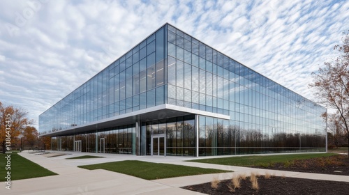 Exterior shot of a modern glass building reflecting the sky with clean, geometric lines and metallic accents