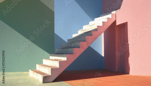 step, stair, concrete, building, exterior, colourful, pastel, wall, shadow, sunlight, geometric, modern, design, architectural, vibrant, hue, light, shadow, pattern, perspective, indoor, structure, space, line, angle, colours, gradation, contrast, form, texture, daylight, simple, minimalist, photographic, composition, architecture, urban, fresh, bold, bright