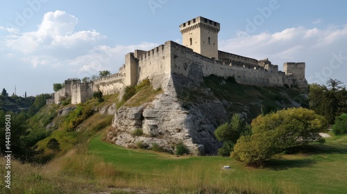castle, stone, hill, fortification, mediaeval, view, exterior, landscape, nature, fortress, defense, ancient, ruin, grey, white, light, high, grand, tower, wall, elevation, prominence, hilltop, green, grass, tree, sky, cloud, sunny, day, outlook, panorama, architecture, historic, europa, structure, rugged, rock, mountain, scenic, vista, fort, old