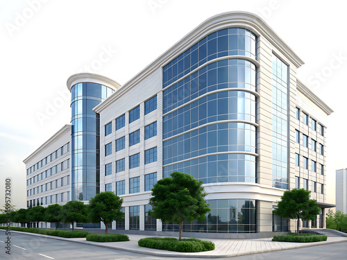 Exterior view of a modern office building with glass facade and green trees along the street view