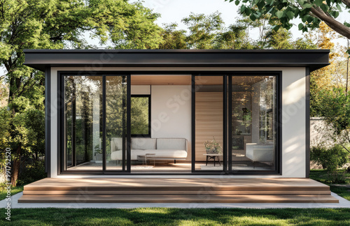 exterior view of the small modern garden house with sliding doors, showcasing its minimalism and elegance