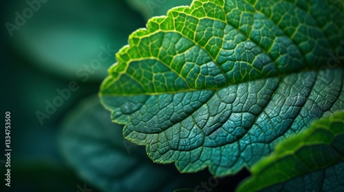 Extreme close up macro photograph of a vibrant green leaf, revealing the intricate details of its veins and textured surface, with clearly defined serrated edges in a lush natural environment