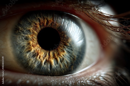 Extreme close-up of a human eye showing intricate details of the iris, pupil, eyelashes and skin texture