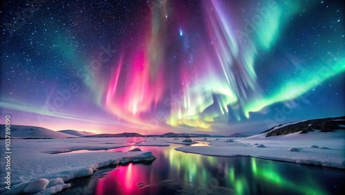 Extreme close-up pink aurora borealis northern light over ice and snow landscape