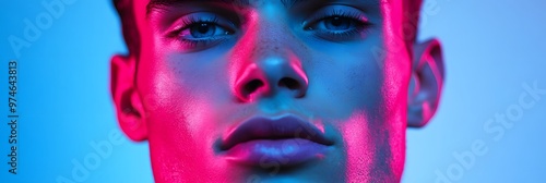 young men, closeup, blue, pink, portrait, dramatic, intense, futuristic, modern, shadow, moody, vibrant, face, fashion, trendy, illuminated, striking, cool, artistic, edgy