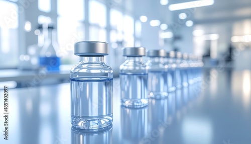 Extreme macro capture of a realistic vaccine vial, highlighting subtle glass reflections and a clean, clinical laboratory atmosphere.