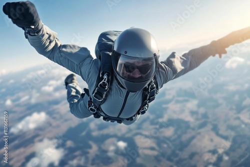 Extreme skydiving adventure captures thrill of free fall from high altitude above scenic landscape