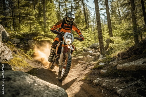 motocross, forest, trail, adventure, motorcycle, outdoors, extreme sport, sport, nature, cycling, speed, motion, recreational pursuit, mountain biking, sports race, activity, riding, exercising, one person, bicycle, mountain, avocation, adult, tree, man, athlete, biker, summer, cycle, footpath, fun, dirt bike, rider, glove, helmet, hair, wind, sun, shadow, generative, ai
