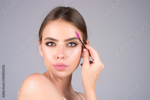 Eyebrow makeup. Beauty model shaping brows with brow pencil closeup. Womans eyebrows with eyebrow brush. Natural make up. Modeling brows. Comb eyebrows.