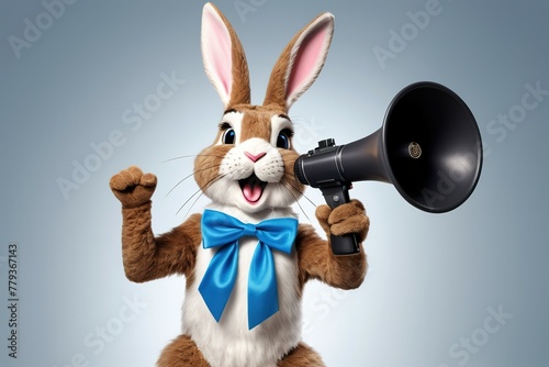 Eye-Catching Easter Bunny Collage with a Megaphone: Perfect for Promotions, holiday, ad, job questions. Vacancy. Business discount concept, communication, information, news, media relations team.