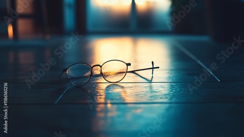 goggles, eyewear, spectacle, sunset, sunrise, light, floor, wood, surface, home, indoor, room, window, dusk, dawn, orange, yellow, blue, teal, dark, shadow, shiny, gleam, bright, blurry, background, still, quiet, calm, peace, serenity, solitude, alone, lost, found, object, frame, lens, metal, style, fashion, accessory, vision, sight, perspective