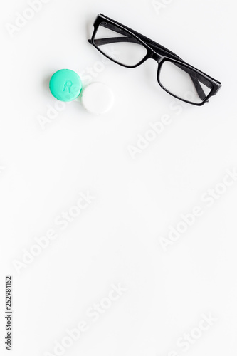 Eyes care. Glasses with transparent lenses and contact lenses on white background top view space for text