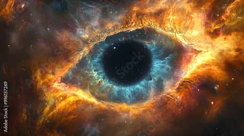 black, hole, nebula, center, eye, shaped, cosmic, galaxy, space, star, orange, blue, light, explosion, universe, celestial, dark, pattern, aethereal, deep, imagery, science, astronomy, form, artwork, fantasy, aglow, region, astronomic, design, artistic, high-coloured, swirl, beauty, vision, glow, colourful, nature, gas, vibrant, view