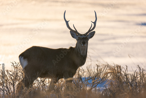 Ezo Deer Silhouetted at Sunset in Notsuke Peninsula, Hokkaido, Japan