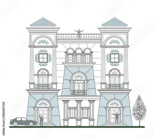 Facade of 3 storeys symmetrical modern classic house with 2 doors, 10 windows, long balustrade, frame, 7 columns, decoration, canopy, crowns, balcony, trapezoidal wall elements and triangular roof.