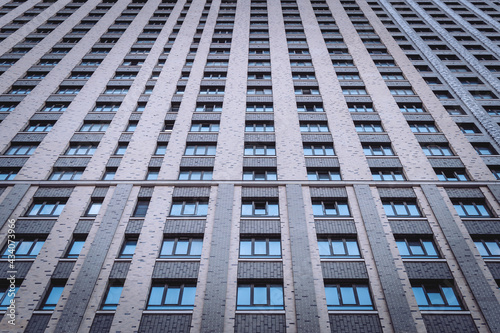 Facade of a huge modern residential skyscraper. Rows of windows. Monotonous colors in dark tones. Depressive urban environment. Lower angle view. Texture or background
