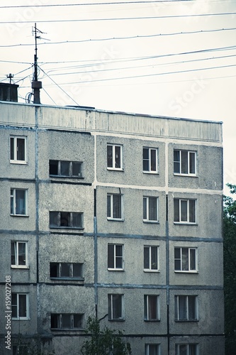 Facade of old multi-storey building from times of USSR