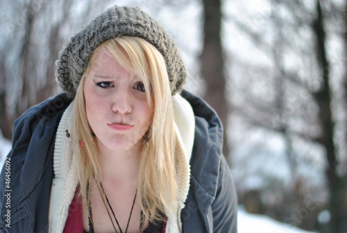 girl, woman, snow, winter, season, happy, insouciance, nature, coolness, play, blond, young, bow, pose, countryside, snowy, face, funny, expressing