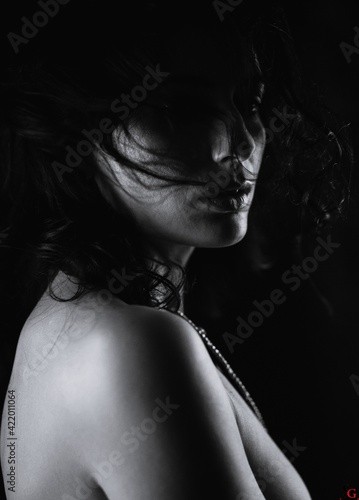 woman, beauty, portrait, beautiful, young, black, fashion, model, hair, naked, dark, face, glamour, body, people, white, person, studio, human, lady, brunette, sensual, shadow, dress, cute