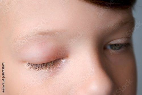 Face of boy with a swollen eye from an insect bite, closeup view. Allergy to insect bites. Closed red sick eye of a teen boy. Eye disease in a child, conjunctivitis, inflammation in the eye.